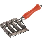 Etrille ouverte 8 rangs pour le pansage du bétail, avec brides en fil de fer et manche en bois. Conçue pour un entretien efficace du pelage et un bon confort en main.
